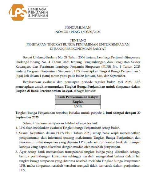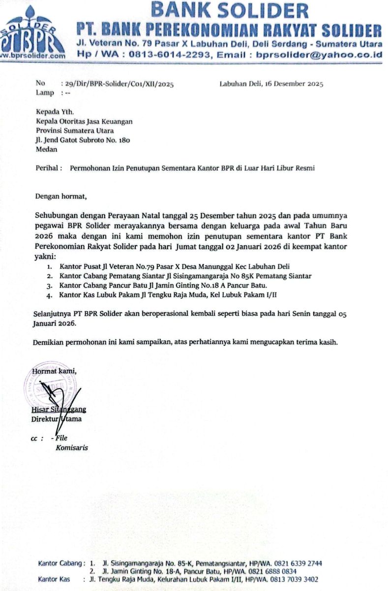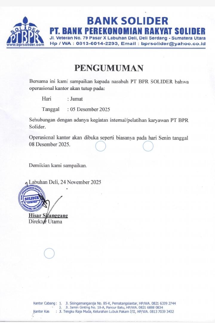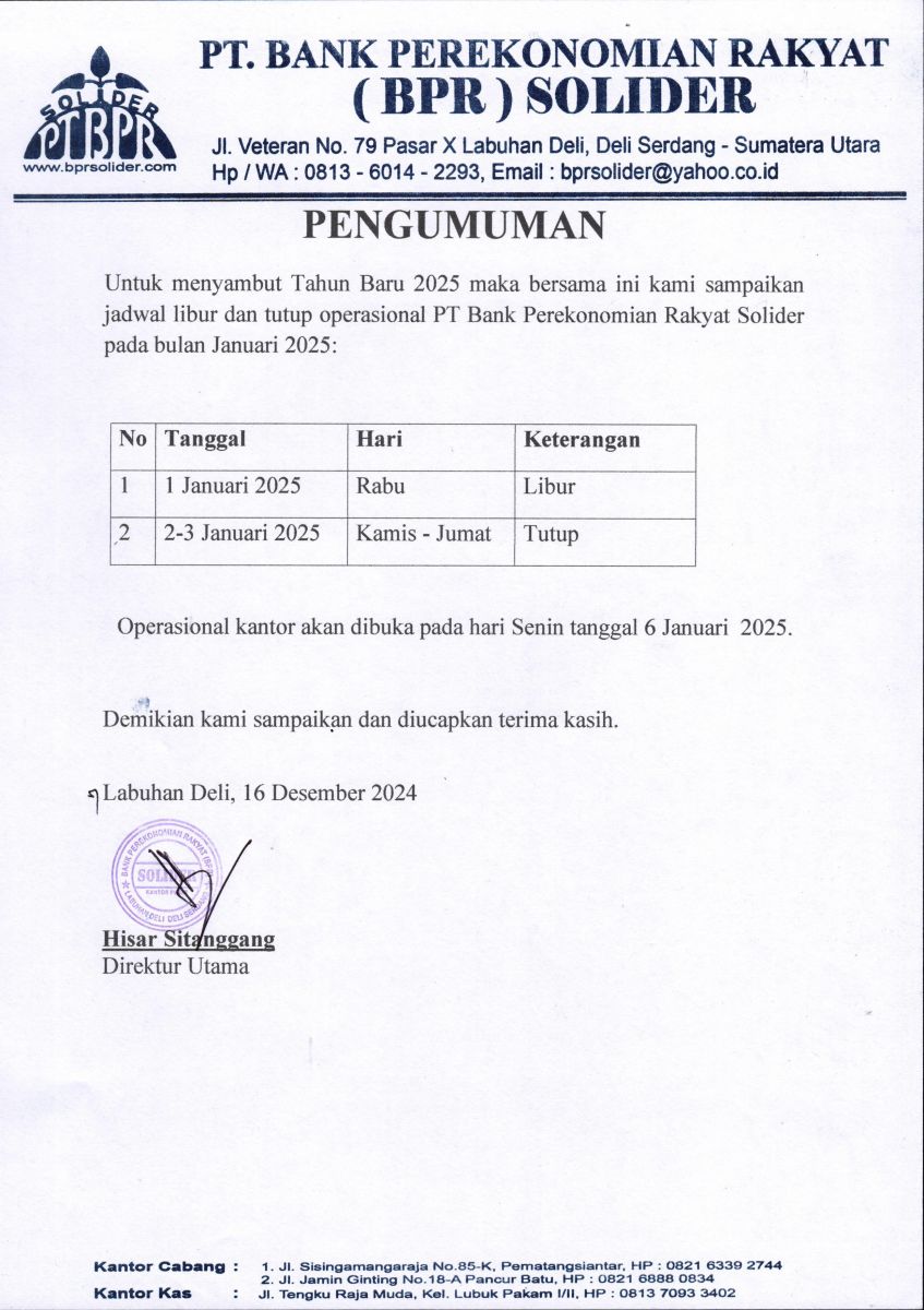 Untuk menyambut tahun baru 2025 maka bersama ini kami sampaikan jadwal libur dan tutup operasional PT. Bank Perekonomian Rakyat Solider pada tanggal 02 dan 03 Januari 2025.